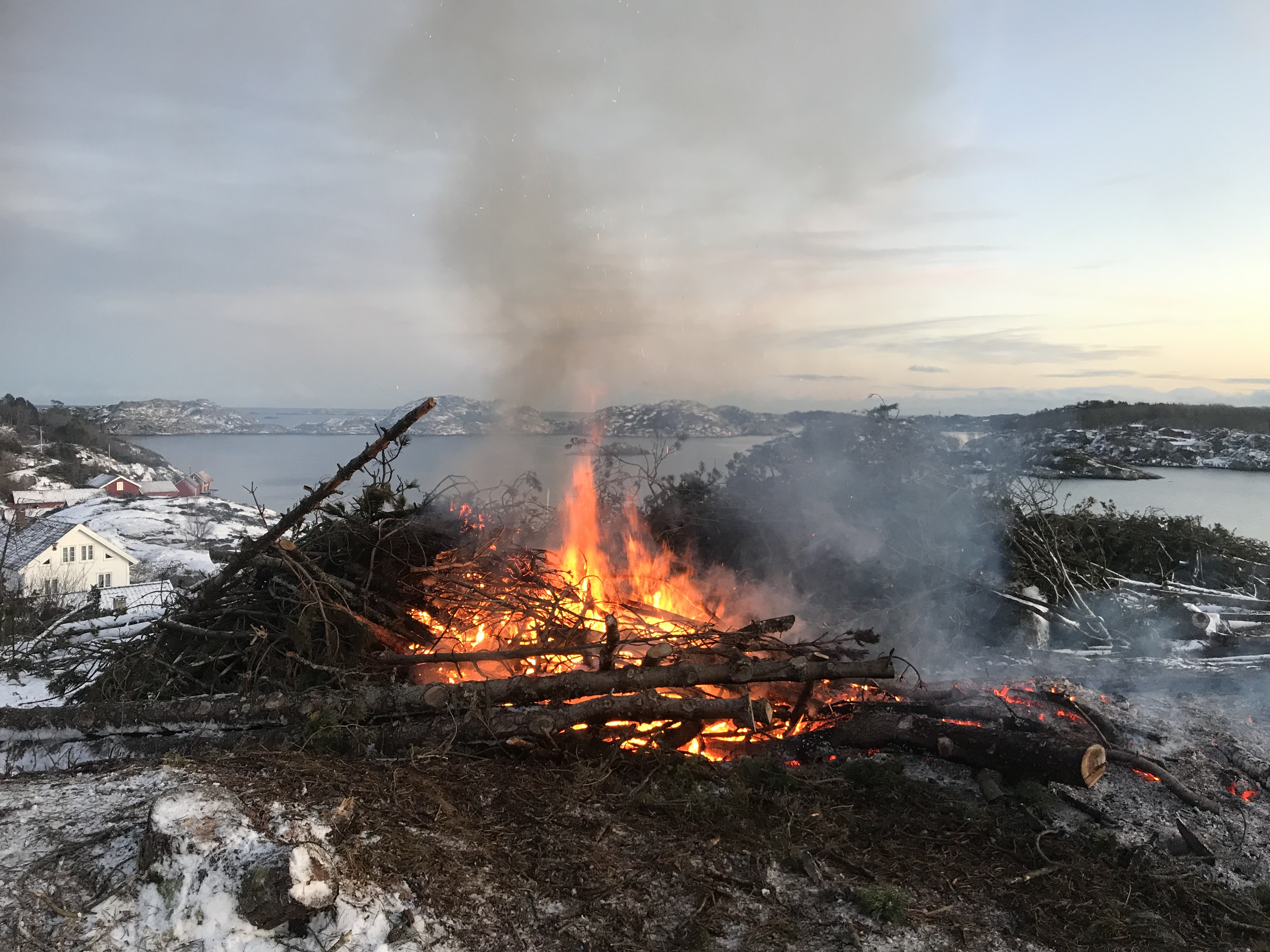 bål på kirkesteinsheia 2025 21 store bål ble det av greiner fra skogryddingen sommeren og høsten 2024. De største var 3-4 meter høye og måtte brennes på snødekke. Snødekke er relativt her ute i havgapet.