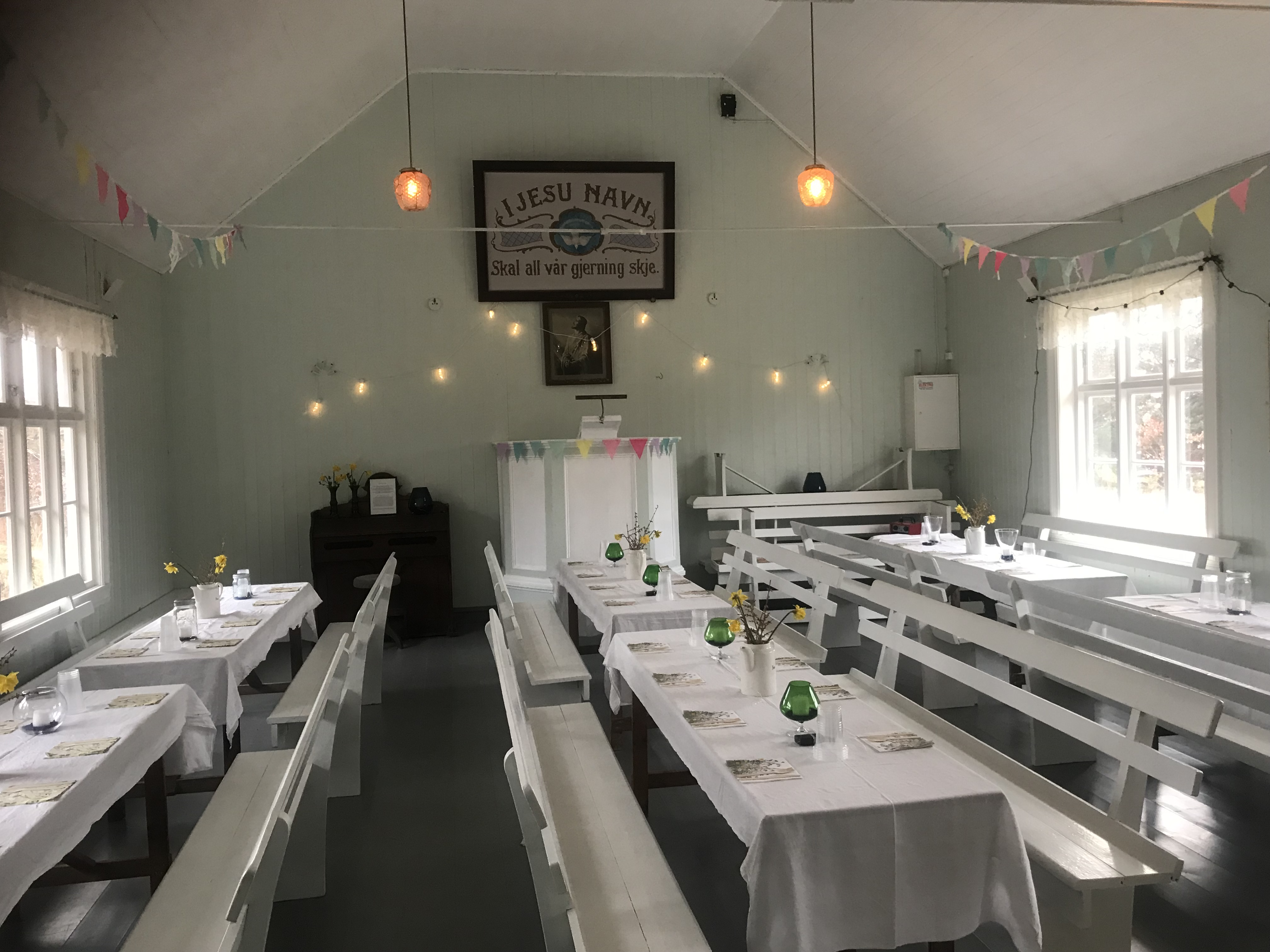 Lokalet på Landøy pyntet til fest for frivillge og brannkonstabler.