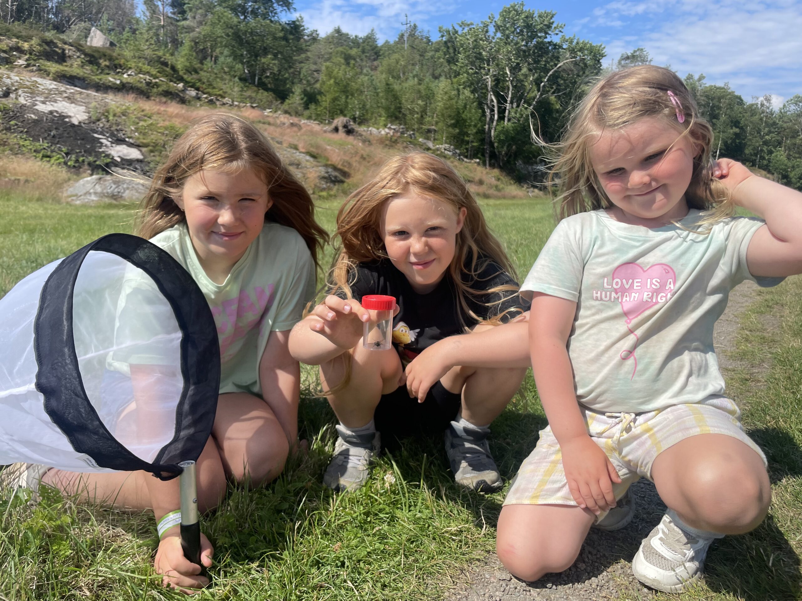Sofia, Ida og Elsa var blant deltakerne i humlesafarien. Her har de fanget en åkerhumle.