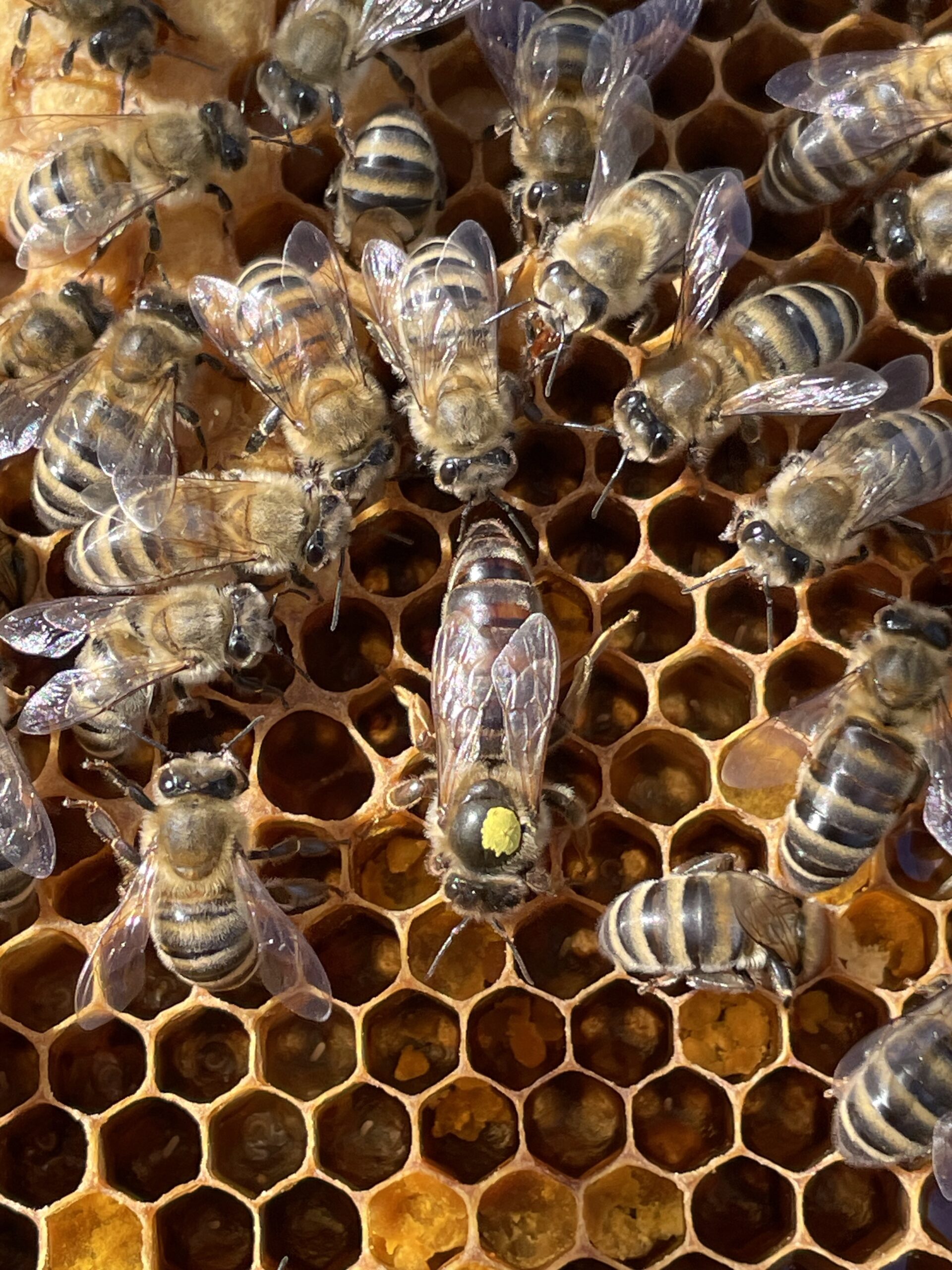 Honningbier; dronninger , droner og arbeidere, i kubene til birøkter Bente Skjerven i Rodeløkkens kolonihager. Biene har fyllt blomsterpollen fra hagen i cellene for å fore yngelen sin. I juni vokser bifolk mye i størrelse og trenger god tilgang på pollen og nektar.